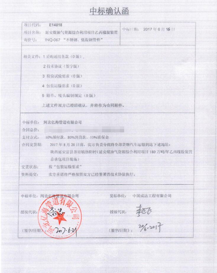 我公司成功中標成達院延能化項目乙丙橡膠裝置不銹鋼、低溫鋼管件